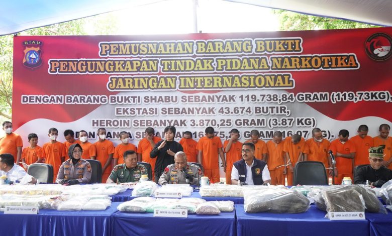 Dalam kegiatan pemusnahan barang bukti narkotika yang digelar hari ini, Polda Riau memusnahkan Barang Bukti Narkoba terdiri dari sabu seberat 119,7 kg, heroin 3,87 kg, ekstasi sebanyak 43.674 butir, dan ganja seberat 16 kg.