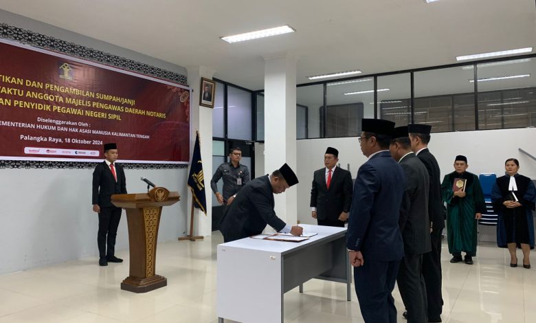 KOTIM, BORNEO7.COM – Kepala Lembaga Pemasyarakatan (Lapas) Kelas IIB Sampit, Meldy Putera, dari Kantor Wilayah Kementerian Hukum dan Hak Asasi Manusia (Kemenkumham) Kalimantan Tengah, secara resmi dilantik sebagai anggota Pengganti Antar Waktu (PAW) Majelis Pengawas Daerah Notaris (MPDN) Kotim, Jum’at (18/10/2024).